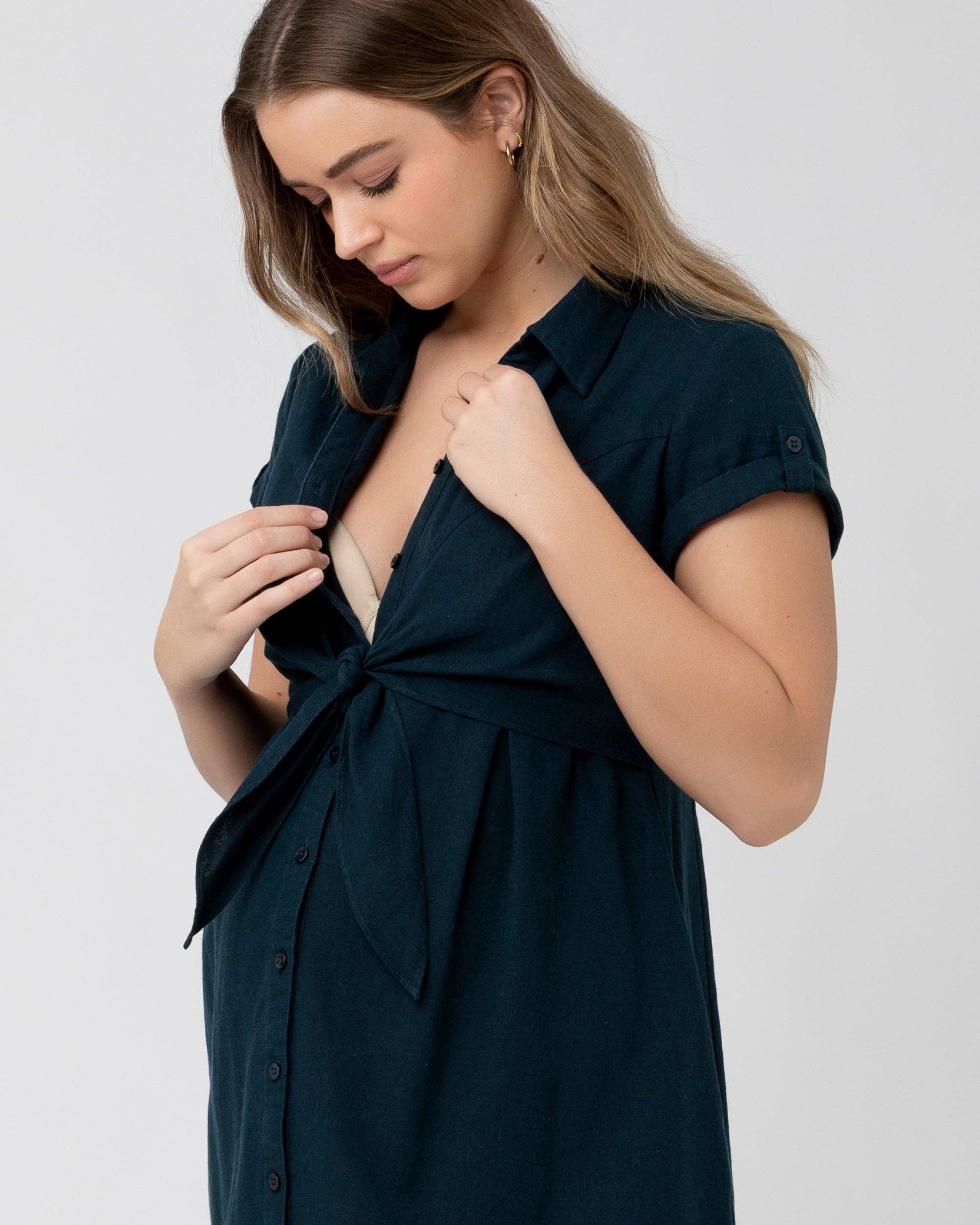 Ease into summer in the Colette Tie Up Linen Dress. Cut from a soft breathable Viscose Linen blend, this daytime dress features an a-line silhouette and a nursing friendly button through placket.